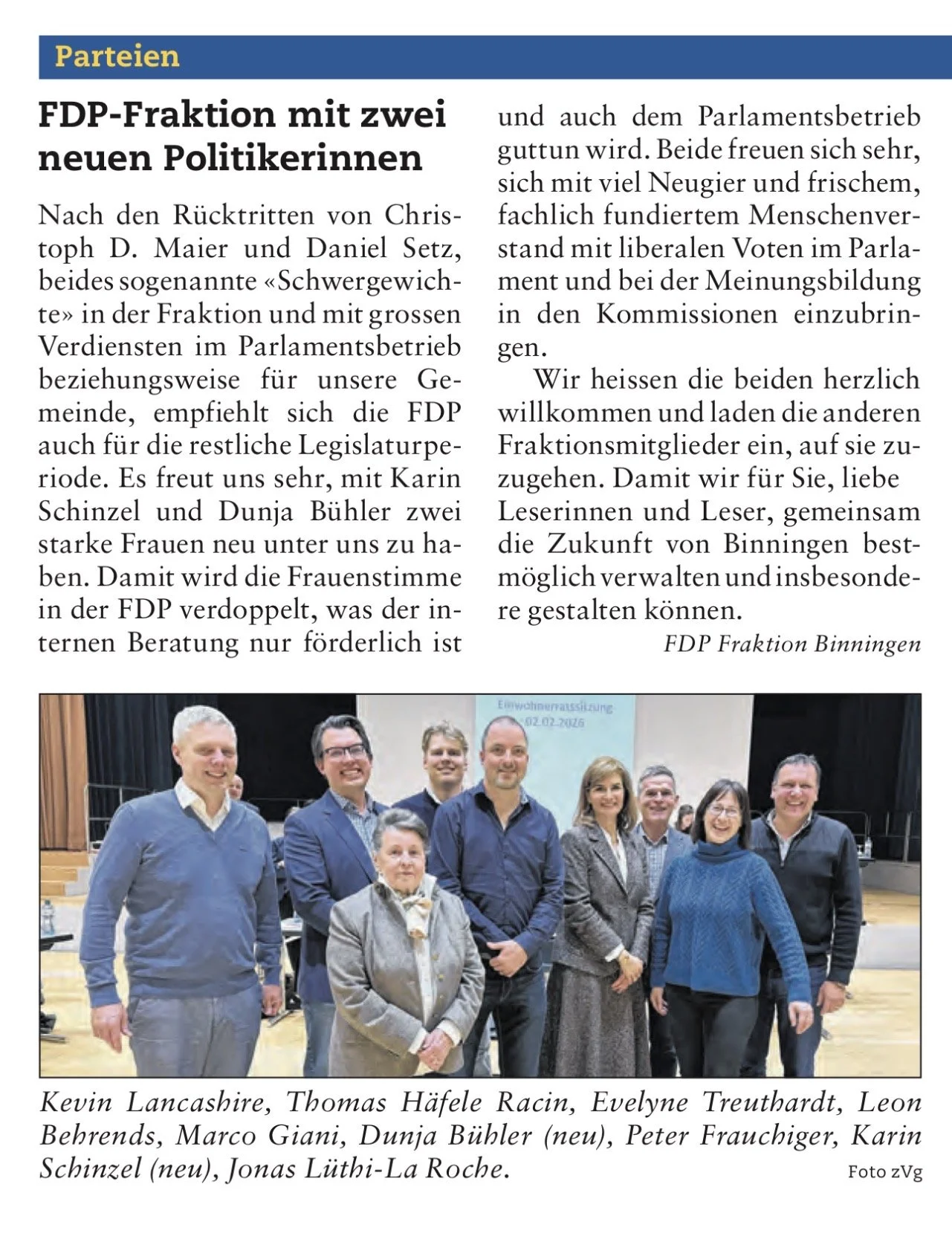 Die FDP-Fraktion Binningen stellt sich neu auf. Nach den Rücktritten der erfahrenen Mitglieder Christoph D. Maier und Daniel Setz rücken Karin Schinzel und Dunja Bühler nach.